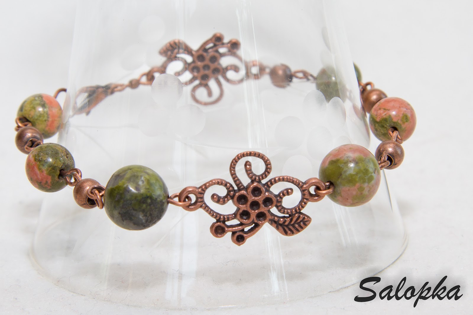 Jakiś czas temu zrobiłam bransoletkę z unakitem. W połączeniu z miedzią wyszła zjawiskowo.